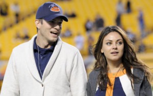 Ashton Kutchar, left, and Mila Kunis walk along the sideline before the NFL football game between the Pittsburgh Steelers and the Chicago Bears at Heinz Field on Sunday, Sept. 22, 2013, in Pittsburgh. (AP Photo/Don Wright)
